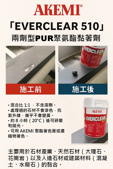 凝膠狀二液型PUR接著劑,石材施作處無暈染(Bleeding)斑痕,耐抗紫外線,幾乎不黃化,無溶劑。 可選用多元酯系列調色顏料進行調色,硬化時間約5小時(20℃)後即可進行後續研磨及拋光處理。 適用於淺色系,白色或透明結晶狀的天然與人造石材以及紙類、木質、玻璃、金屬進行高品質接著與填補。水平面及立面皆可以施作。 顏色 : 無顏色透明。混合比例1(主劑) : 1(硬化劑)。 |